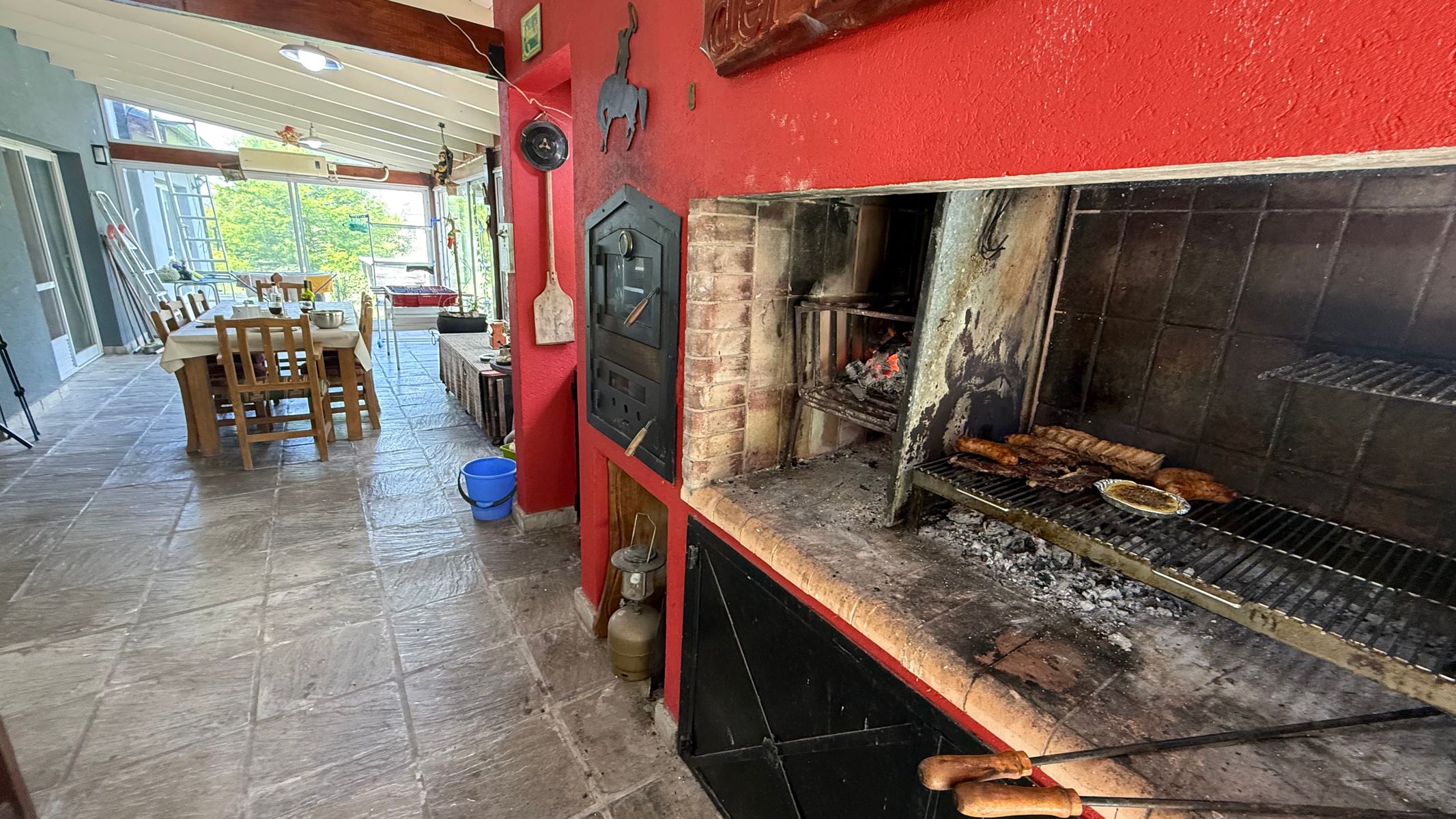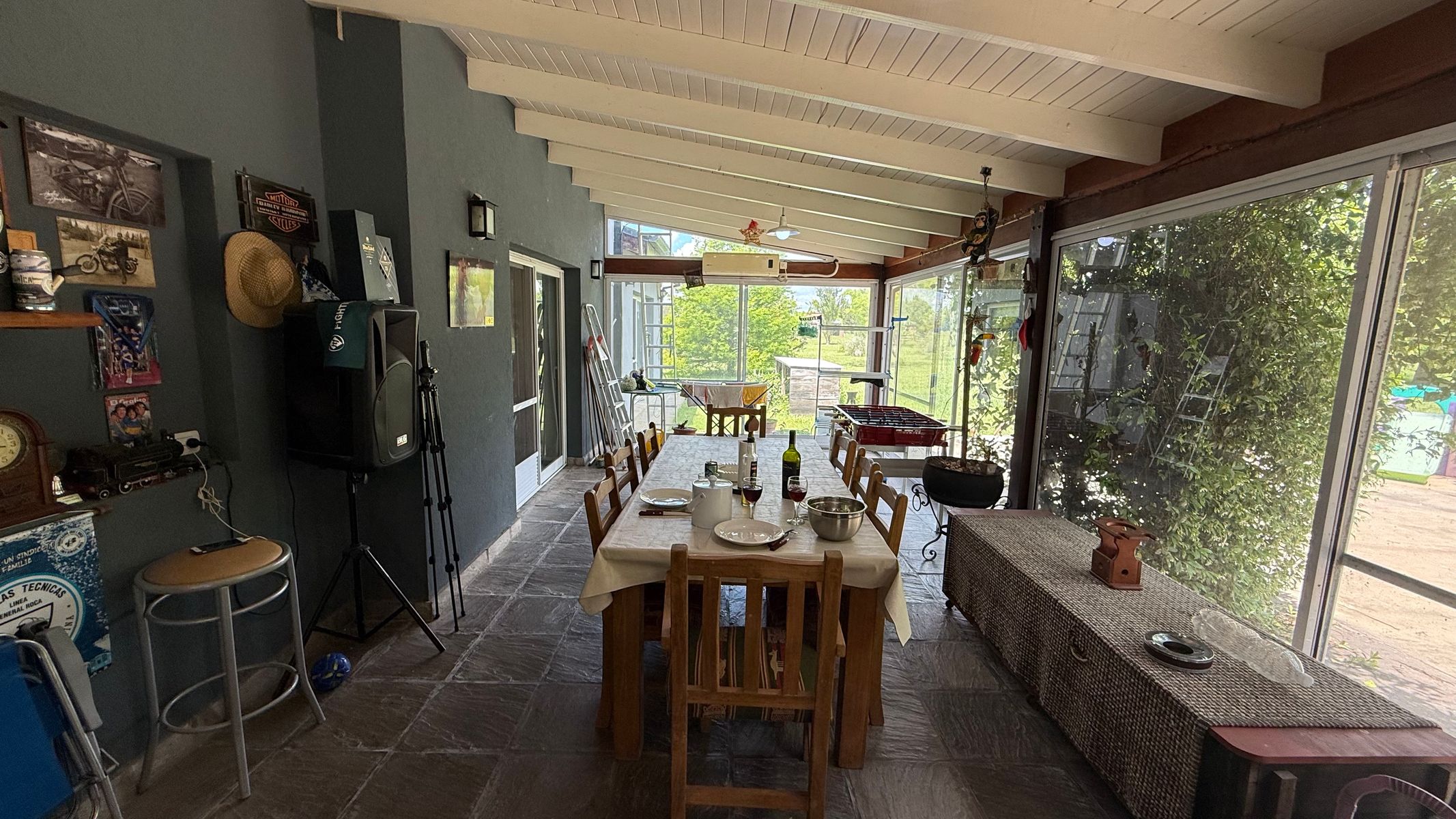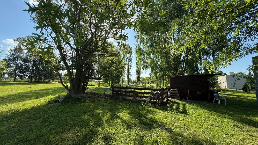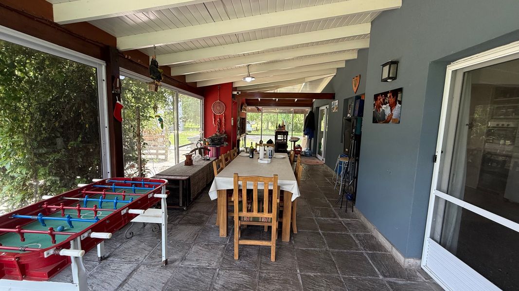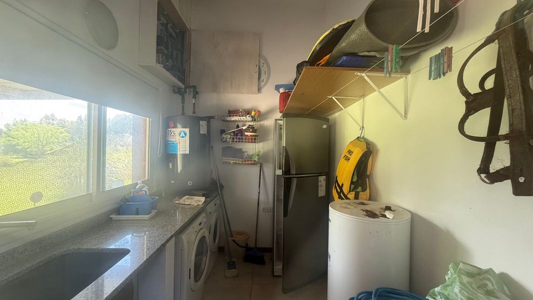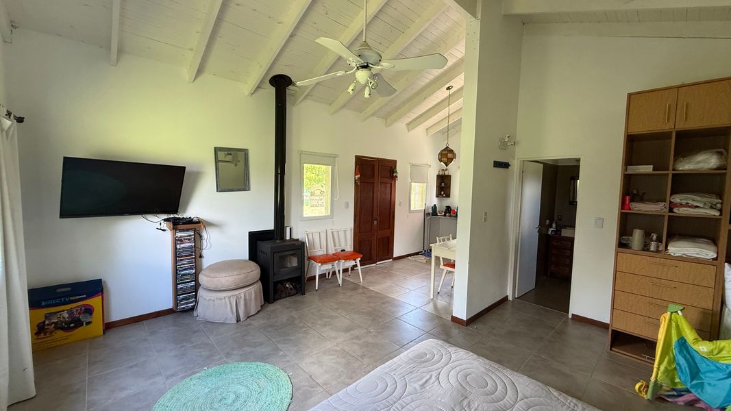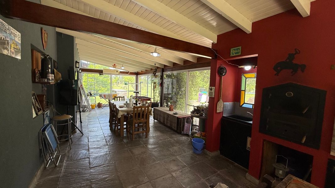 Cocina: Anafe Eléctrico de 4 hornallas, cocina de 4 hornallas y horno con tubos + horno Eléctrico Bosch. Lavavajillas y lavar ropas. Aire acondicionados FC en todos los ambientes: living (+hogar a leñas Tromen), comedor, cocina, suite, galería quincho cerrado. Suite: con placar vestidor, calefactor a leña Tromen, ante baño, ducha y bañera doble con Hidromasajes, Aire Acondicionador Frio Calor. Galería: cerrada con puertas ventanas de aluminio anodizado blanco, mosquiteros, Parrilla con bajo mueble para guardado de cosas, más pileta de lavado, y horno pizzero a leña Tromen. Aire Acondicionador Frio Calor. Casa de huéspedes: totalmente equipada, con somier, sillón cama, calefactor a leña Tromen, TV , frigo bar, mesada y anafe, Aire Acondicionador Frio Calor Semi descubierto para auto. Termotanque eléctrico, lavadero con lavar ropas y secarropas. Piscina con equipo completo y todas sus bombas, equipo Dolphin para limpieza. Bomba presurizadora. Cortinas Black out y rolles en todos los ambientes. Espacio Baúl para guardar las cosas de pileta como barre fondo, cloro etc. + pérgola que da sombra (+cortinas)Garaje para dos camionetas + Moto o cuatriciclo Con baño y mesada con pileta. Todo con agua fría y caliente. Dos galpones de madera de 3x3 para guardar tractor de 17,1" corta pasto, bordeadora y demás elementos de jardinería, herramientas y otros. Interior: 2 heladeras, 1 somier de 2x2, 2 sillones cama de 2 mts, 1 mesa comedor para 10 personas, 1 mesa galería quincho para ocho personas. Generador de Luz para toda la casa.
